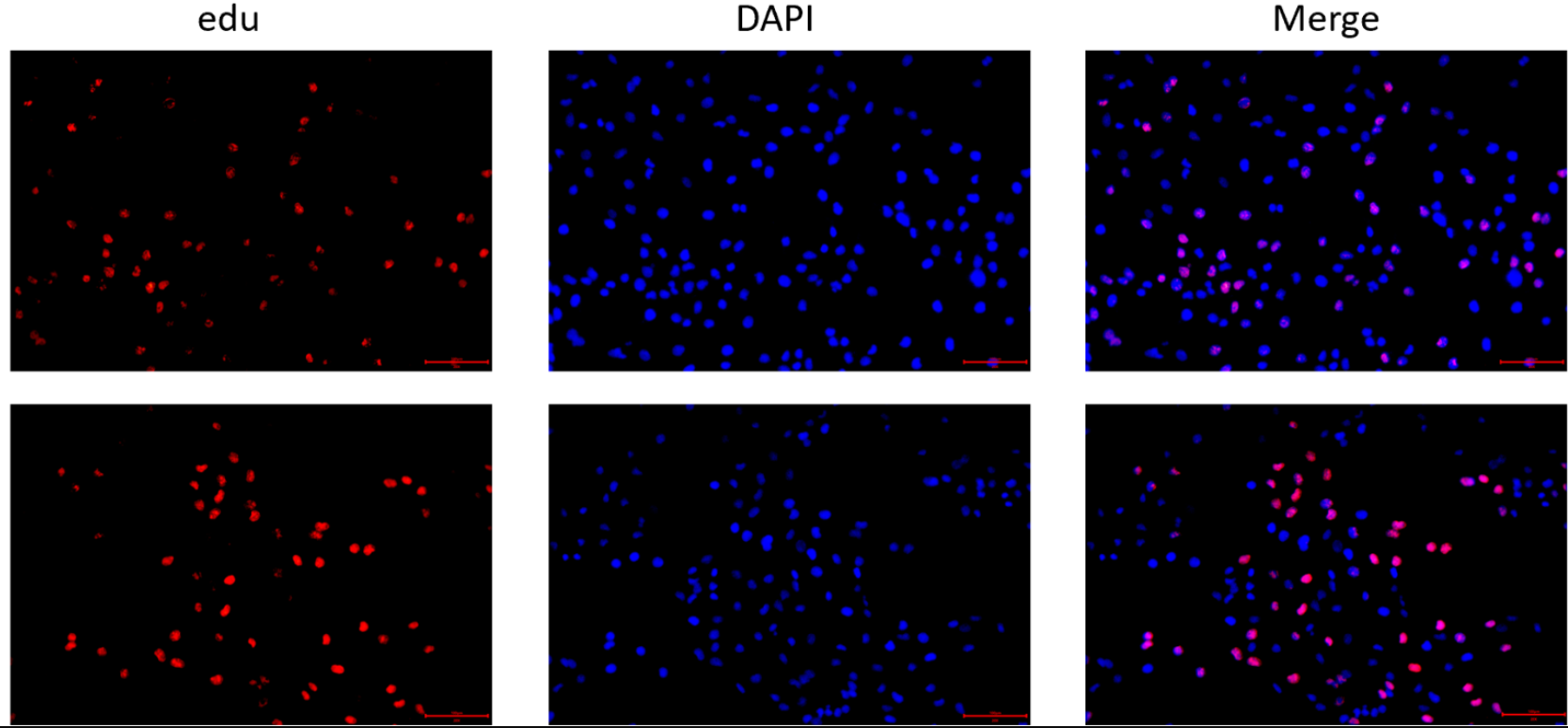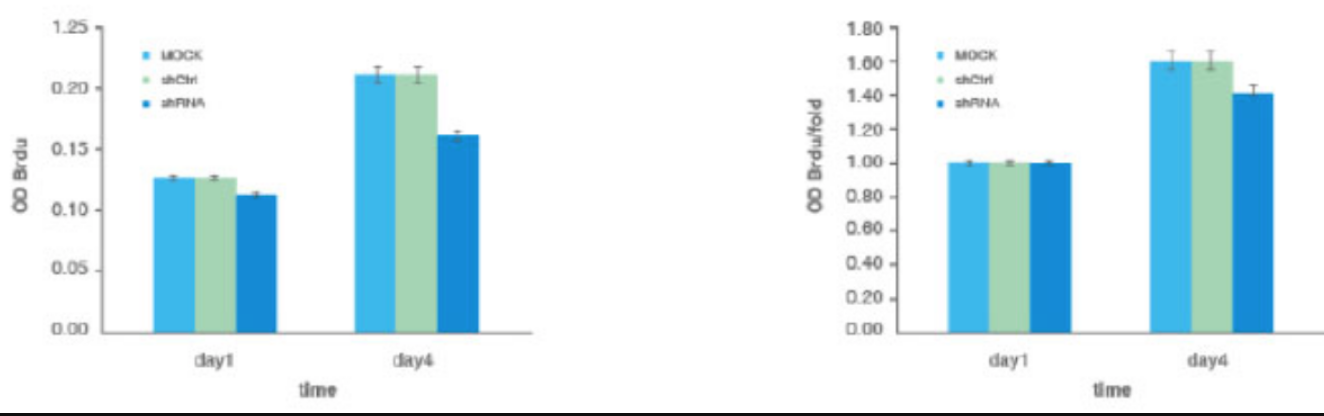 溴脱氧尿嘧啶核苷(bromodeoxyuridine, BrdU)是DNA前体胸腺嘧啶核苷类似物,可竞争性掺入S期细胞单链DNA核苷酸序列替代胸腺嘧啶,利用抗体连接酶或荧光素作为指示系统标记BrdU,当处于旺盛分裂的细胞掺入BrdU后,即可检测出含有BrdU的细胞,并以此判断细胞的数目。固相包被细胞的微孔中加入BrdU抗体,经过彻底洗涤后用底物TMB显色。TMB在过氧化物酶的催化下转化成蓝色,并在酸的作用下转化成最终的黄色。颜色的深浅和样品中的BrdU呈正相关。用酶标仪在450 nm波长下测定吸光度(OD值),通过OD值的高低,反映正在合成DNA细胞数的多少,从而反映正处于增殖状态的细胞量。