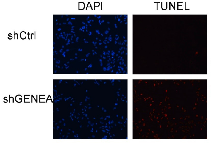 细胞在发生凋亡时,会激活一些DNA内切酶,这些内切酶会切断核小体间的基因组DNA。细胞凋亡时抽提DNA进行电泳检测,可以发现180-200bp的DNA ladder。基因组DNA断裂时,暴露的3’-OH可以在末端脱氧核苷酸转移酶(Terminal Deoxynucleotidyl Transferase, TdT)的催化下加上荧光素(FITC)标记的dUTP (fluorescein-dUTP),从而可以通过荧光显微镜或流式细胞仪进行检测,这就是TUNEL (TdT-mediated dUTP Nick-End Labeling)法检测细胞凋亡的原理。