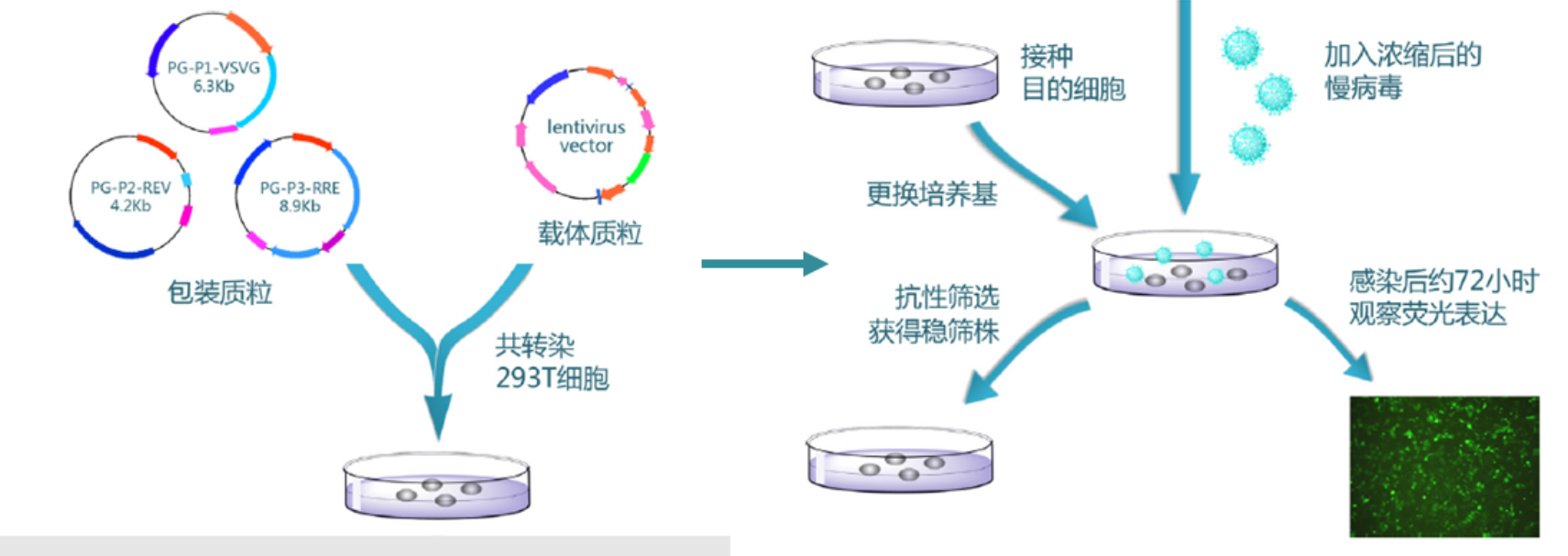 (2)慢病毒侵染。利用慢病毒载体将目的基因或shRNA转染到细胞中,慢病毒载体能将DNA整合到细胞基因组中,从而实现稳定表达。这种方法适用于各种类型的细胞,且整合效率高。