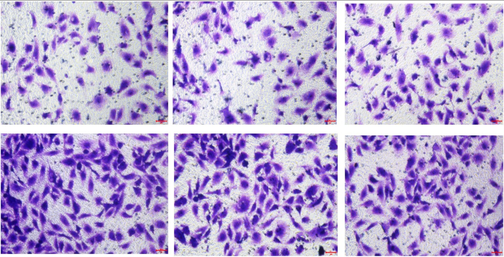 Transwell小室上室为无血清细胞悬液,下室为含血清的培养基,利用细胞对血清中的某些细胞因子的趋向性促使细胞向下室转移,计数进入下室的细胞量可反映细胞转移能力。